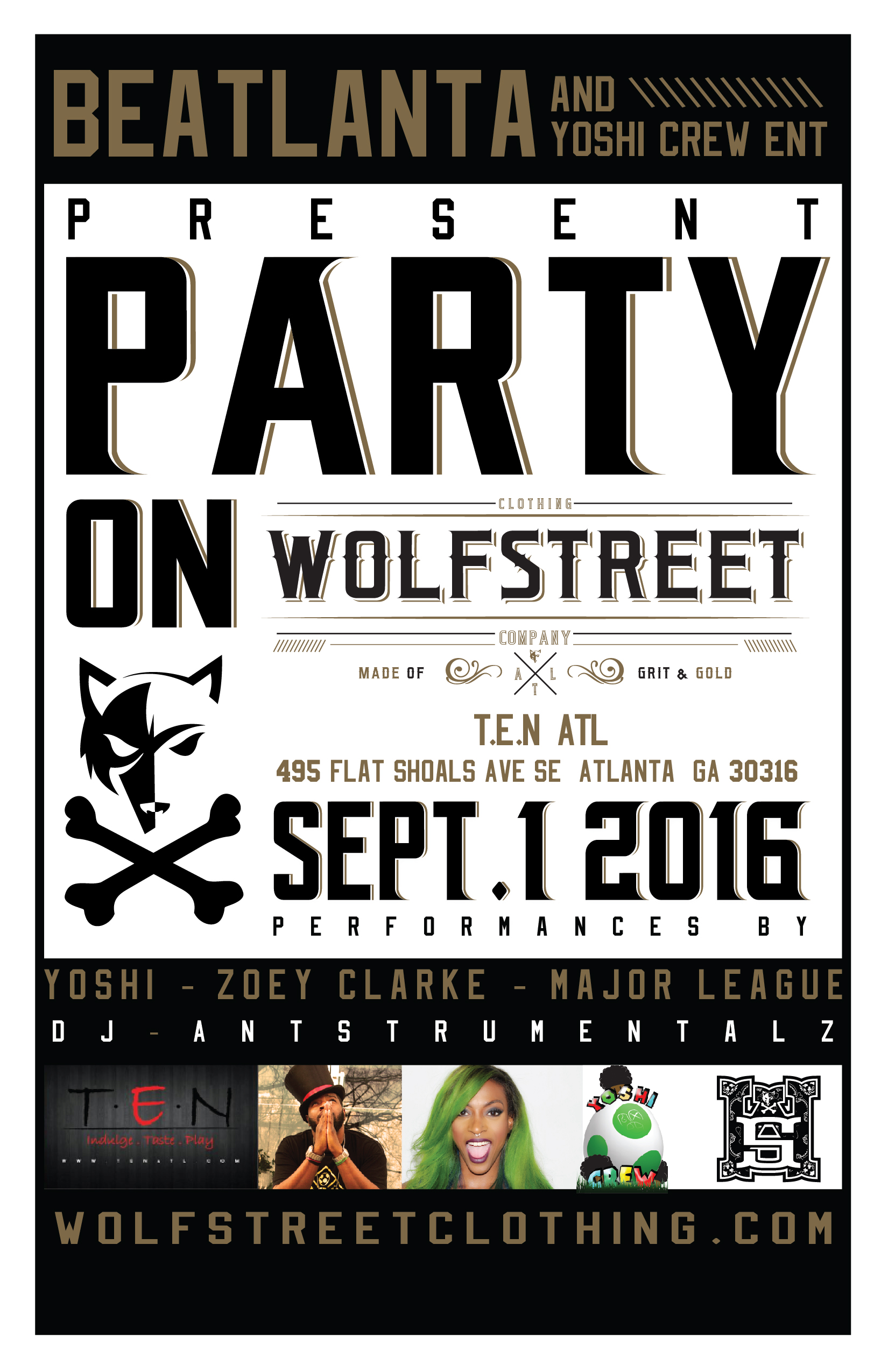 8pm-12am September 1st. Party on Wolfstreet with live performances by Yoshi, Zoey Clarke, Major League, Dj Antstrumentalz and more!. First of many events to come from the fine folks at Wolfstreet Clothing. Come out and show some love for your local ATL talent, Merchandise booth, music, good looking people, hookahs and free swag up for grabs.