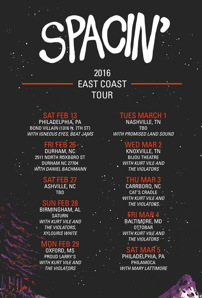 I came across this band by accident while looking through another band’s bandcamp page. It struck me for its old school feel and out front guitars. The vocalist has a Tom Petty thing going and the instrumentals are psychedelic, groovy and loud. I think Spacin would be a kick ass live show. They are heading South very soon – see the flyer below. They’ll be in Nashville on March 1st and Knoxville on the 2nd. Spacin on FaCEboOk.